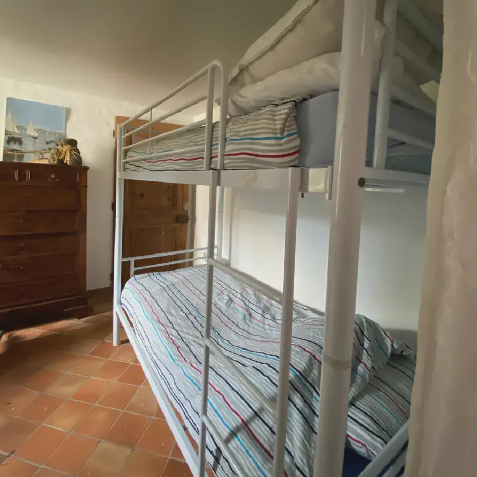 - 1 chambre dite « dortoir » avec un lit double et 2 lits superposés, commode à tiroir, douche et WC, espace cumulus