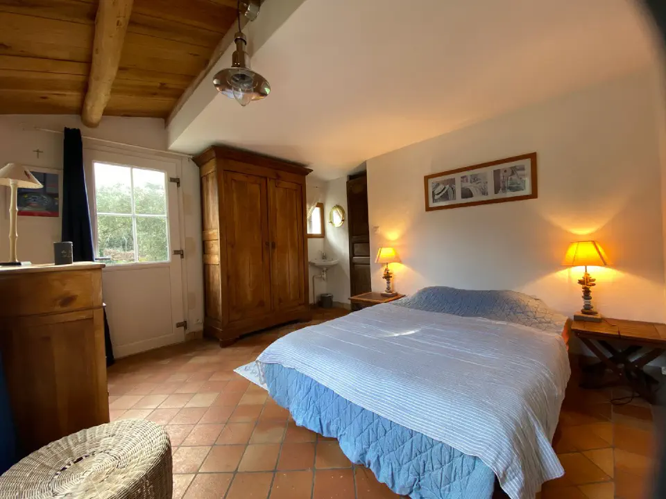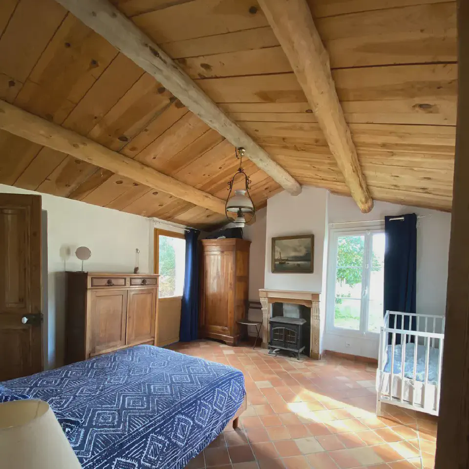A l’étage: 1 chambre avec une petite terrasse, (interdire l’accès aux jeunes enfants). Un lit double 140X200. Armoire de mariage vendéenne, bureau ancien, chaise. Photos en noir et blanc du vieux château et baigneuse, une huile de la pointe des corbeaux. Une salle de bain avec lavabo, une baignoire, un WC, coin repassage, petite commode en pin, étagères en pin : rangement éponges, lit de bébé ancien.