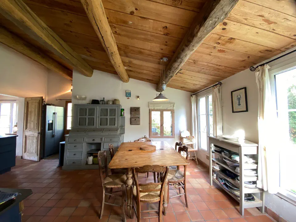La salle à manger comporte une grande table , 7 chaises paillées, une autre table plus petite pouvant servir de rallonge ou de bureau, un table bureau avec dessus en zinc, un meuble contenant de la vaisselle, un ancien lit clos transformé en armoire de rangement (nappes, livres…), une grande malle servant de support à une grande maquette de voilier en bois, 1 grosse lampe en terre cuite, 1 lampe chevet haute, 2 tableaux signés Laporte, un croquis de thonier, un tableau barque de pêcheur dans la tempête, 2 huiles représentant la maison avec un grand arbre et le salon accrochées de chaque côté du grand meuble. Un semainier.